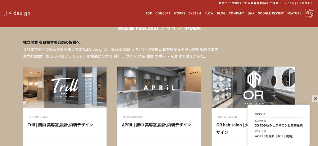 J.V design は、美容室の内装・設計を中心に、サロンの空間デザインおよびブランディングを行っている会社です。東京近郊で多くの美容室施工実績があり、公式サイトでも具体的なサロン事例やデザインコンセプト、仕上がりイメージを多数紹介しており、信頼できる情報量が確認できます。