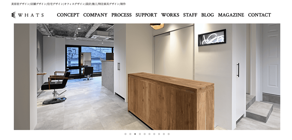 WHATS は、美容室や理容室の内装を中心に手掛ける施工会社です。開業支援から設計・施工、什器製作まで一連の業務に対応しており、東京の美容室オーナーからも幅広く利用されています。落ち着いたデザインから個性的な空間まで柔軟に対応できる点が特徴です。