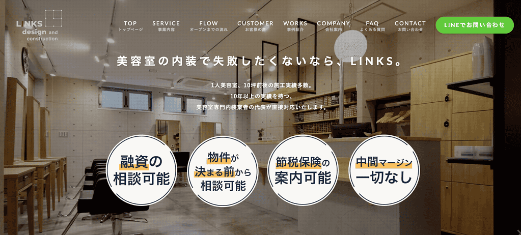 公式サイトでは、「美容室/サロン/クリニック/ネイル/まつ毛サロンなど多業態対応」「デザイナーと施工チームが一体」と明記されており、コストを抑えつつおしゃれで映える空間づくりを得意としています。